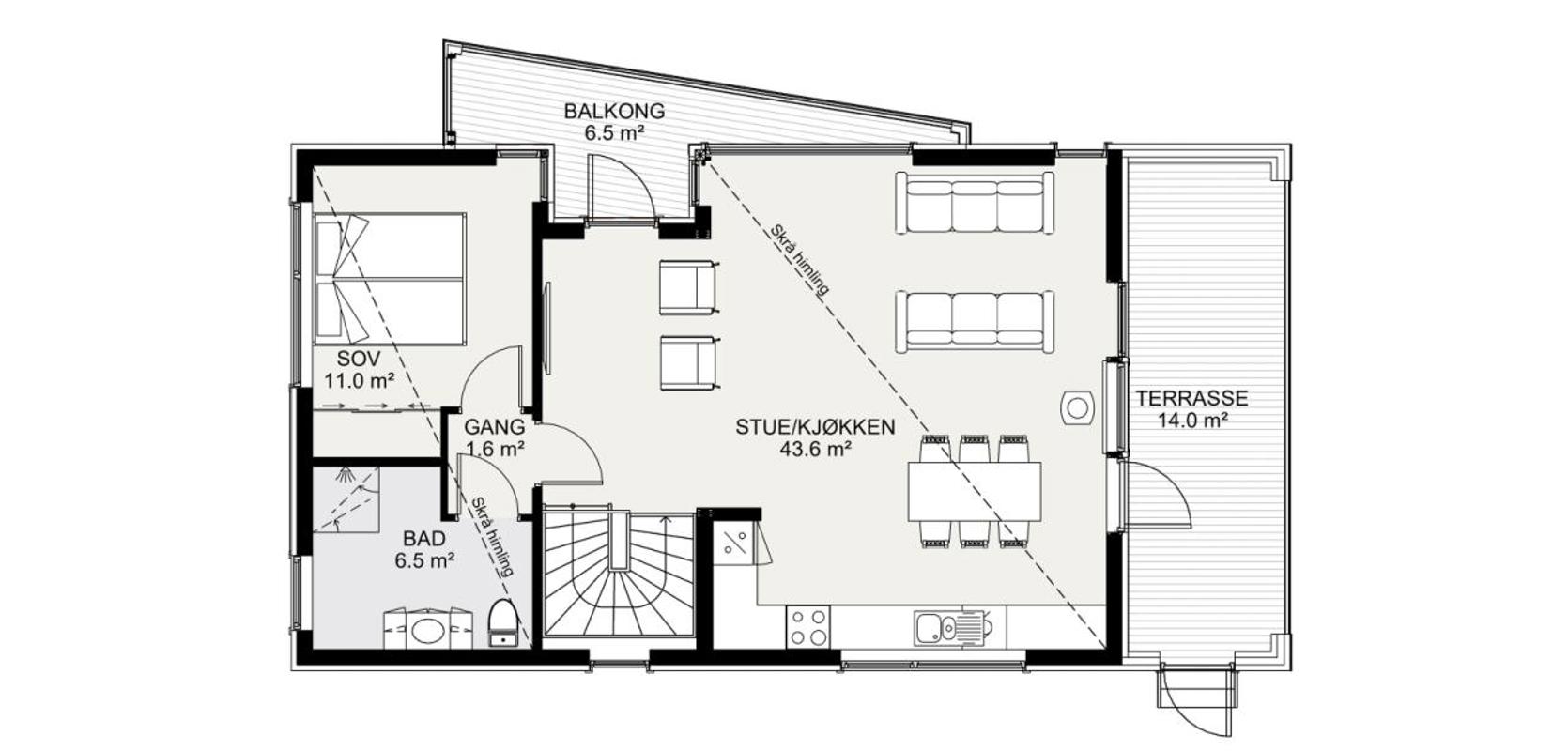På hovedplanet, som nås via en trapp fra underetasjen, finner du en åpen stue- og kjøkkenløsning. Et stort oppholdsrom skaper en luftig atmosfære, og kjøkkenet har god plass og moderne innredning. På dette planet er det også et romslig soverom med eget bad. Fra stueområdet har du utgang til en sjarmerende, skråstilt balkong som gir et flott utsyn fra husets front. En overbygd balkong på husets kortside er tilgjengelig fra stue- og kjøkkenområdet og inviterer til utendørsaktiviteter.