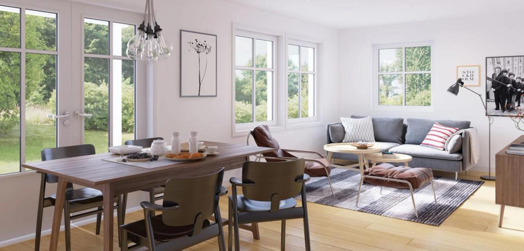 Oppholdsrommet er lyst og åpent, og delt inn i soner som gjør det praktisk for både avslapning og bespisning. Du vil elske å tilbringe tid i dette rommet, med massevis av naturlig lys som strømmer inn gjennom de store vinduene. Terrassen utenfor er også en sjarmerende plass hvor du kan nyte sommerkvelder med familie og venner.