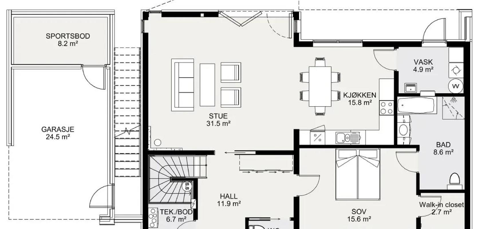 Huset har en integrert carport på den ene siden, som er kombinert med en stor, deilig terrasse. En trapp gir enkel adkomst til terrassen. I tilknytning til carporten finner du også en sportsbod som gir deg god lagringsplass for bildekk, ski, sykler og annet utstyr.
