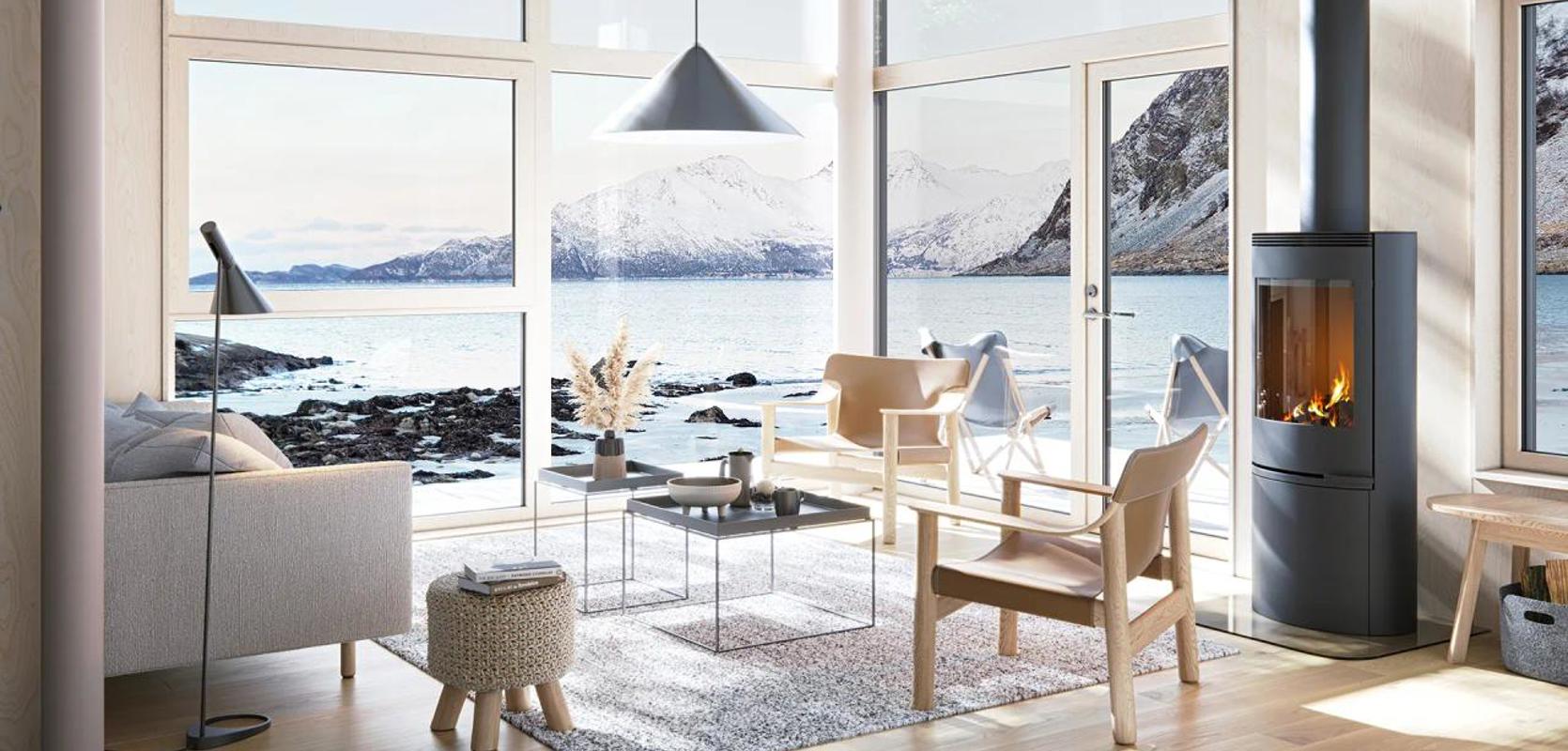 I hele oppholdsrommet vil du oppleve at det føles som om du sitter midt i naturen, og skillet mellom innendørs og utendørs blir flytende. En dør i nærheten av ildstedet gir direkte tilgang til utendørsområdet.